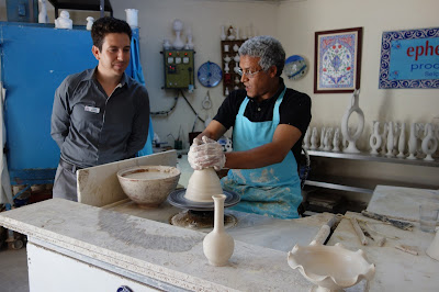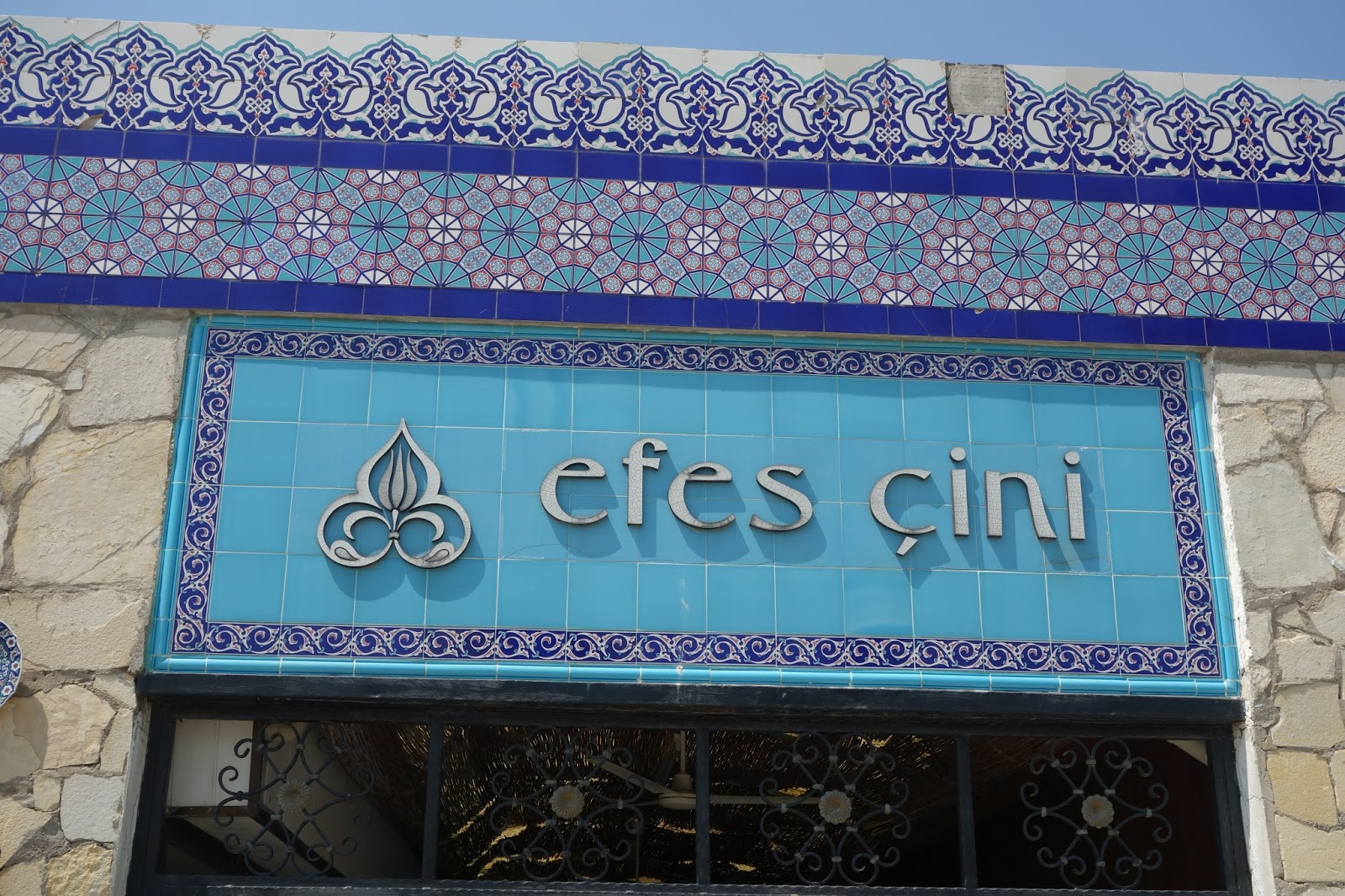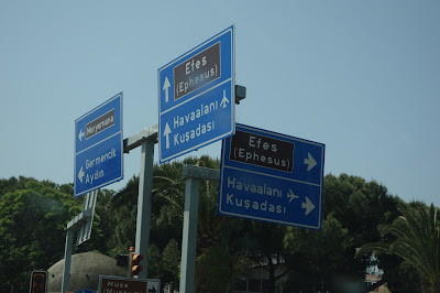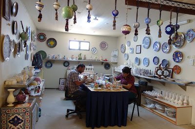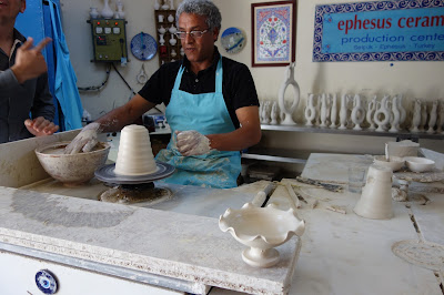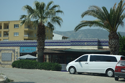 While on our way to see Ephesus one of the wonders of the Ancient World in Turkey.....we always stop at this ceramic place with gorgeous BLUE plates, mugs, platters, etc............ They are an amazing work of art all of their ceramic items. I just like to go and look around the place, is quite big with thousands of pieces......they let you take pics outside but not inside. I noticed the prices are quite sky high and usually we pick up pieces at other smaller establishments at a lower price ...but just to go and look around here is amazing. Then we visit one of the Coffee houses down the street and enjoy a Turkish glass of tea (cay). Love sitting outside those cafes and just watching the people go about their daily lives.